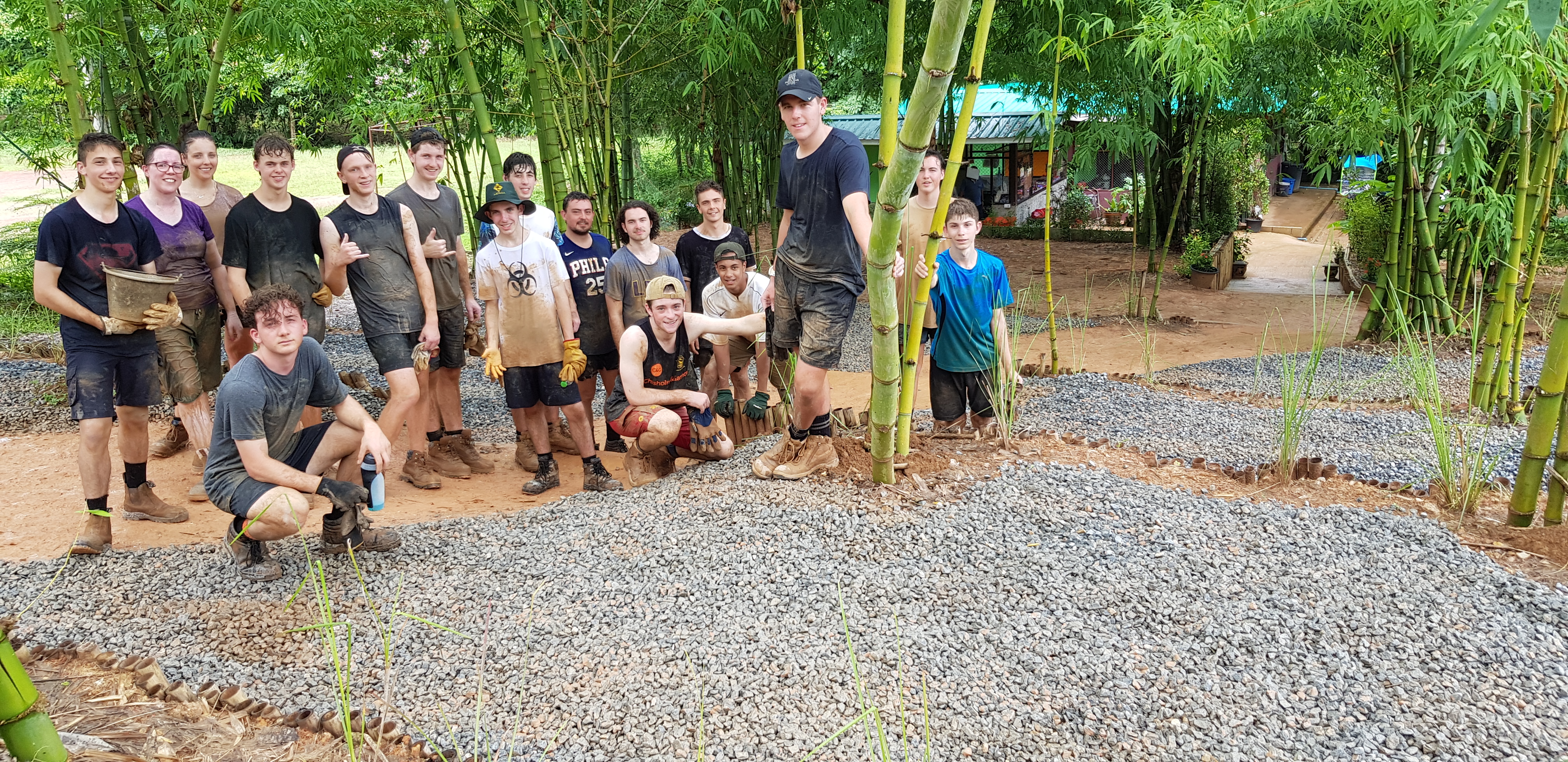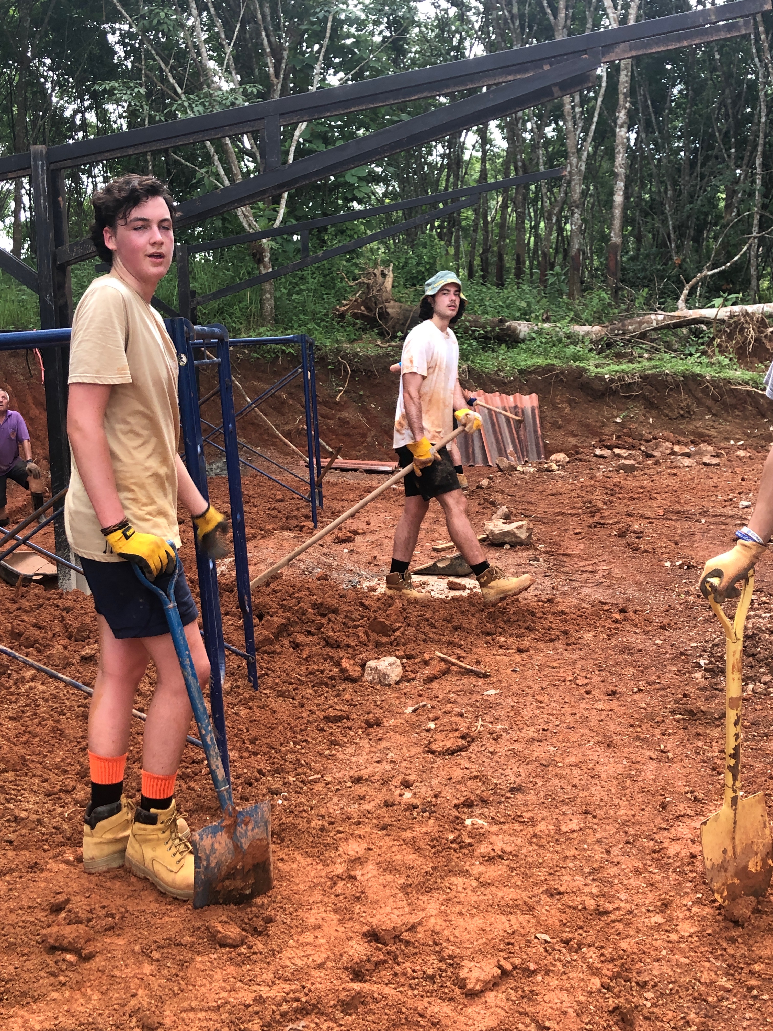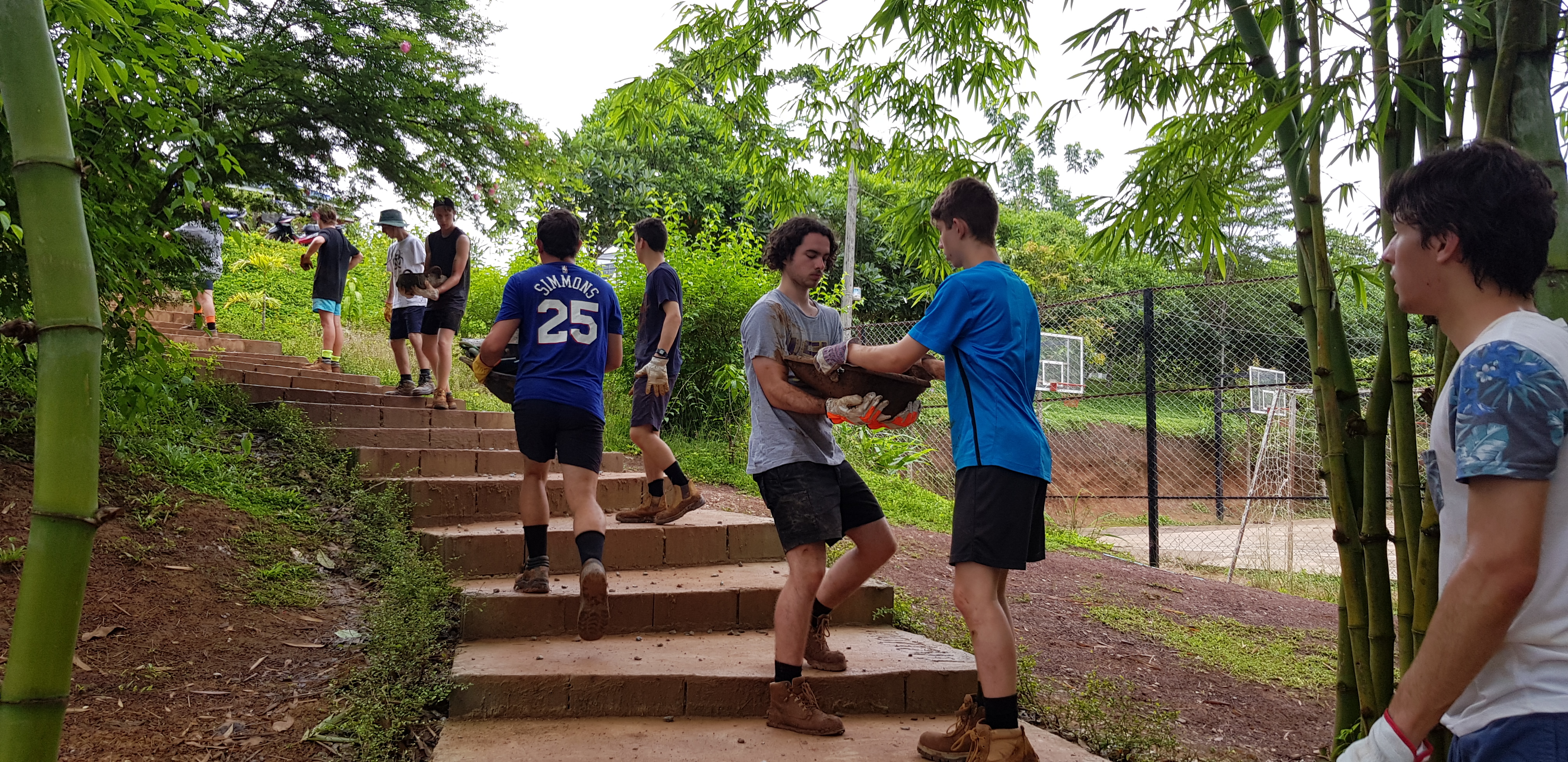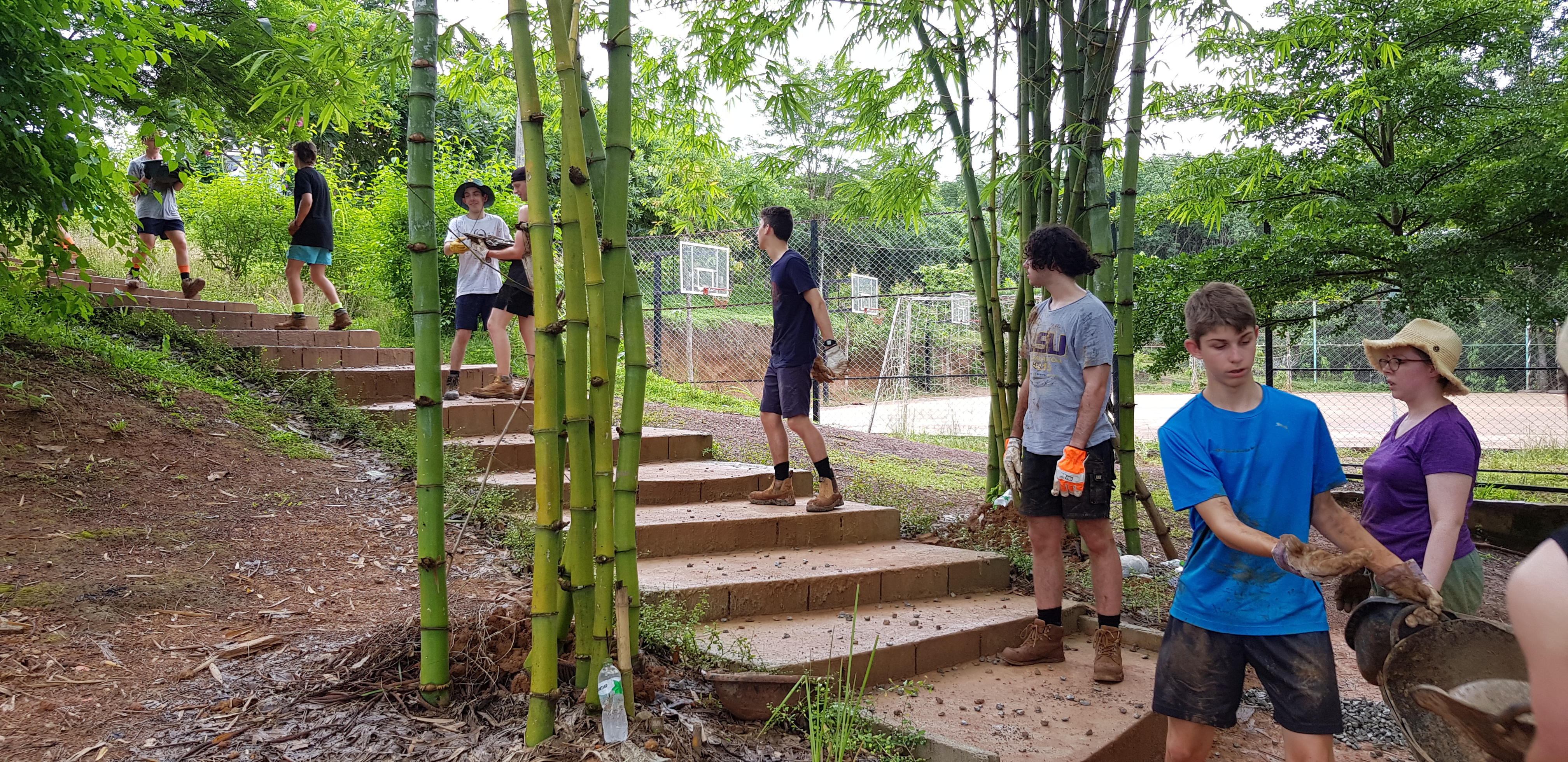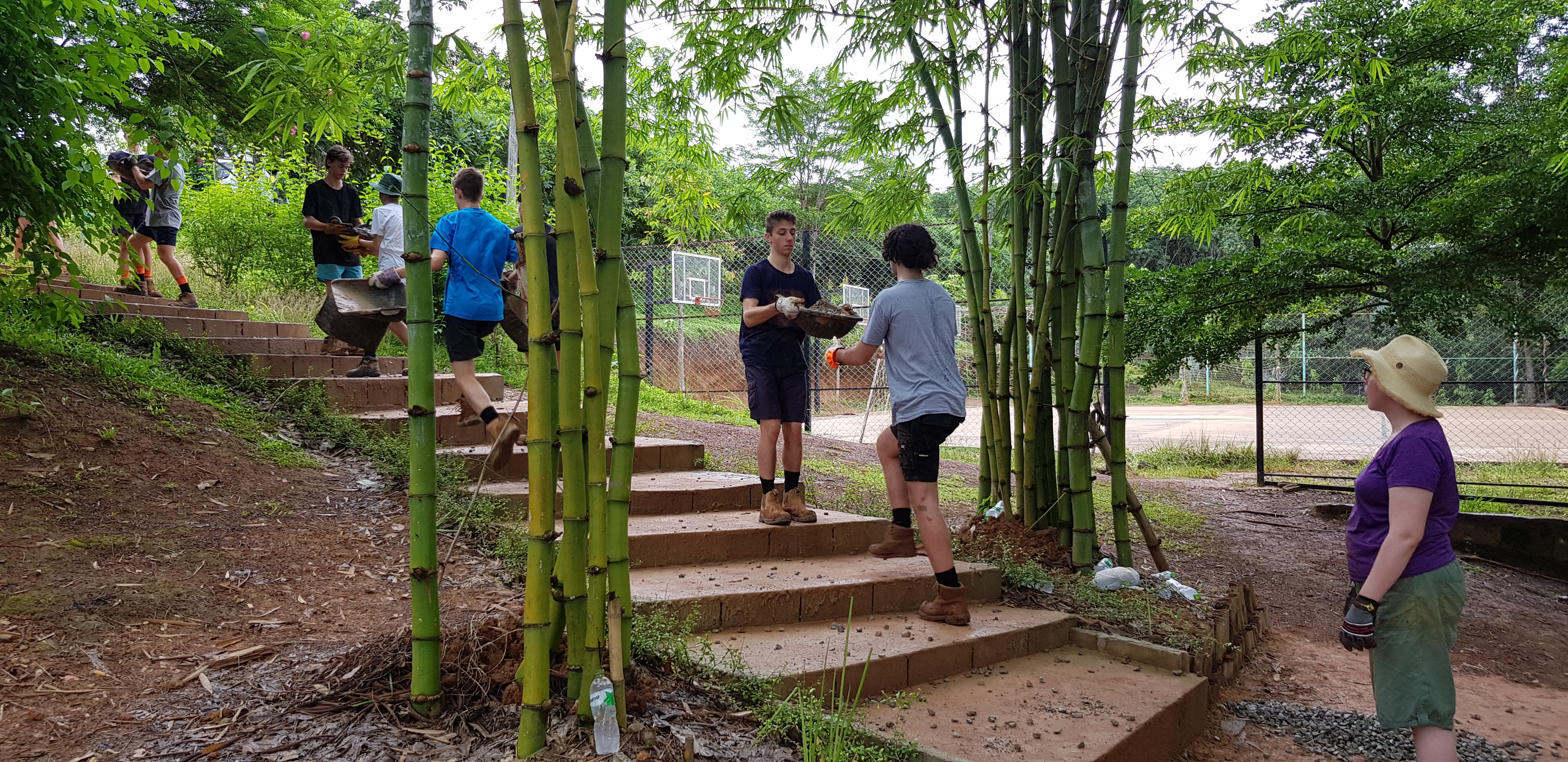 After breakfast, due to the overnight rain, we put a hold on the carpark work and instead began to form a “human centipede” as Billy’s analogy describes, as we transported two truck loads of gravel down a steep flight of stairs to a tiered surface that was prone to flooding. With Ethan and James, the captains for the day at the head of the centipede, and Billy claiming the glory at the tail-end, the “legs”, who worked away tirelessly all morning. Just as we thought we were getting close to finishing, another truck arrived and dumped another load at our displeasure.