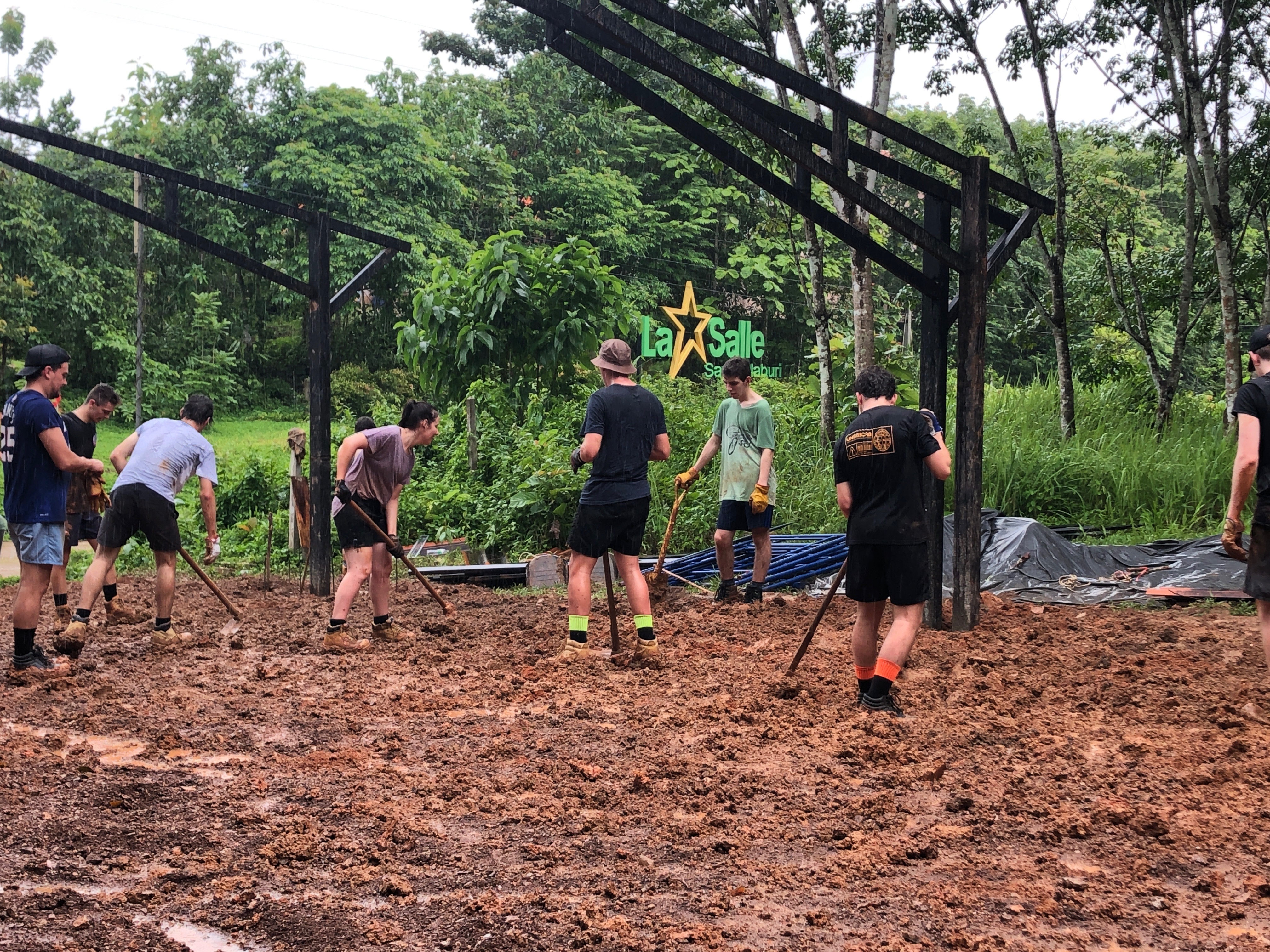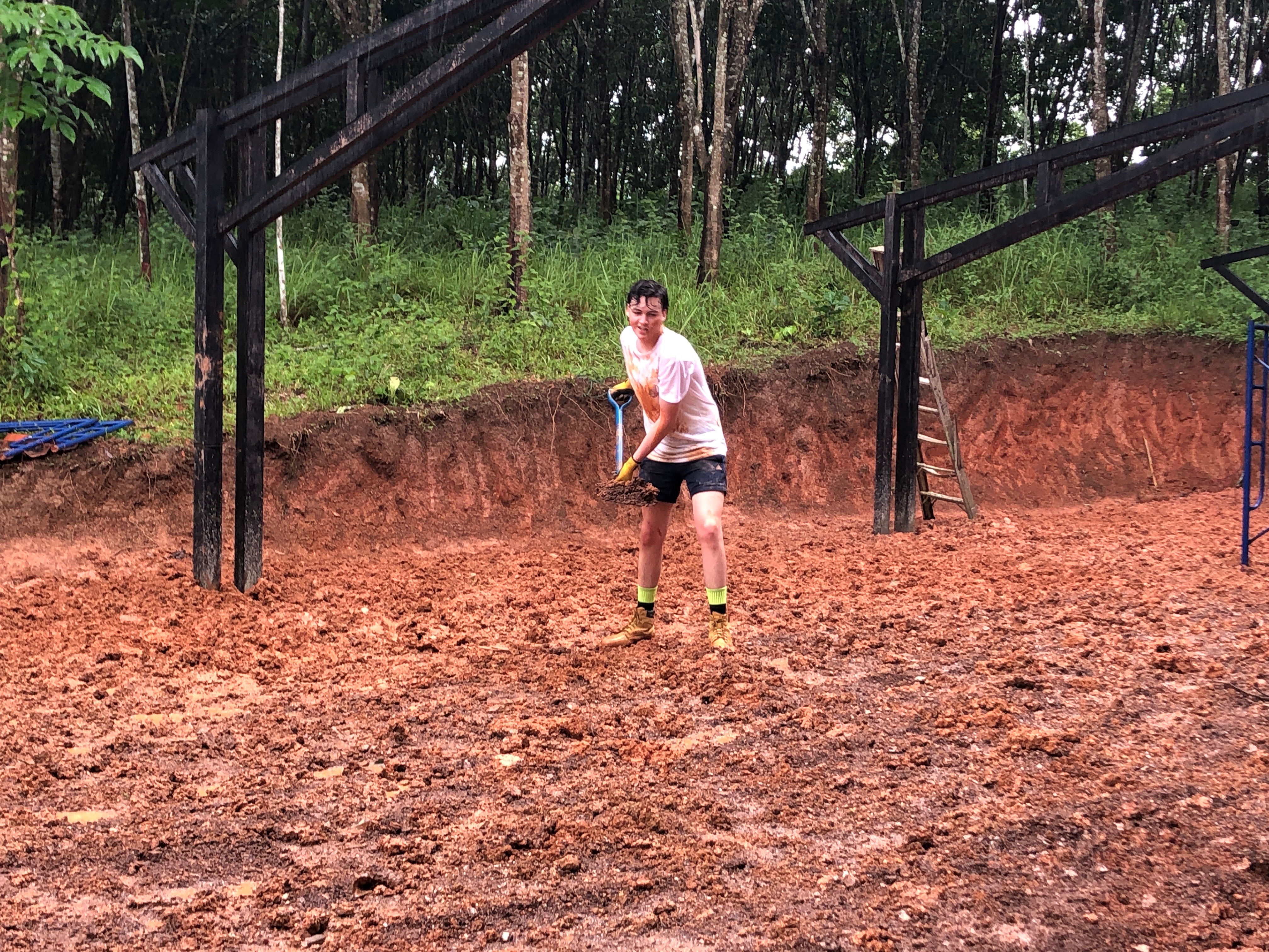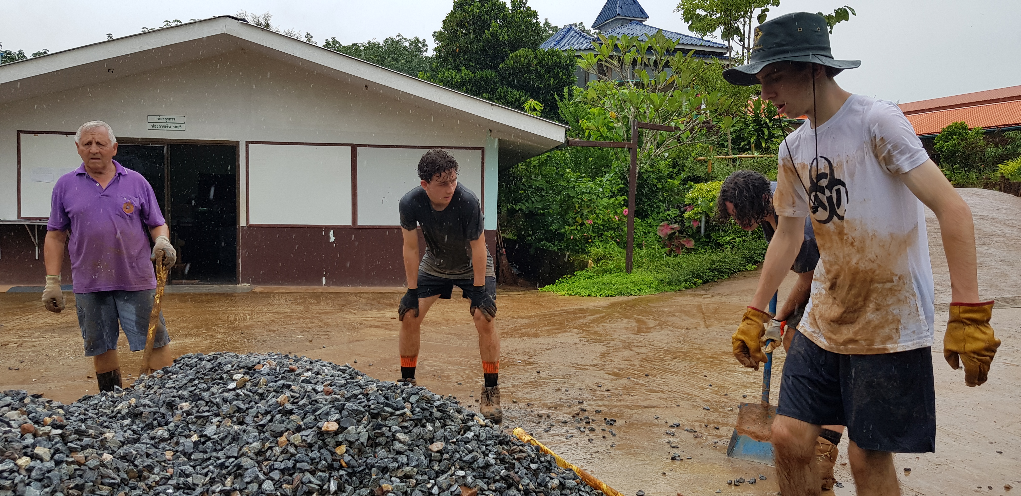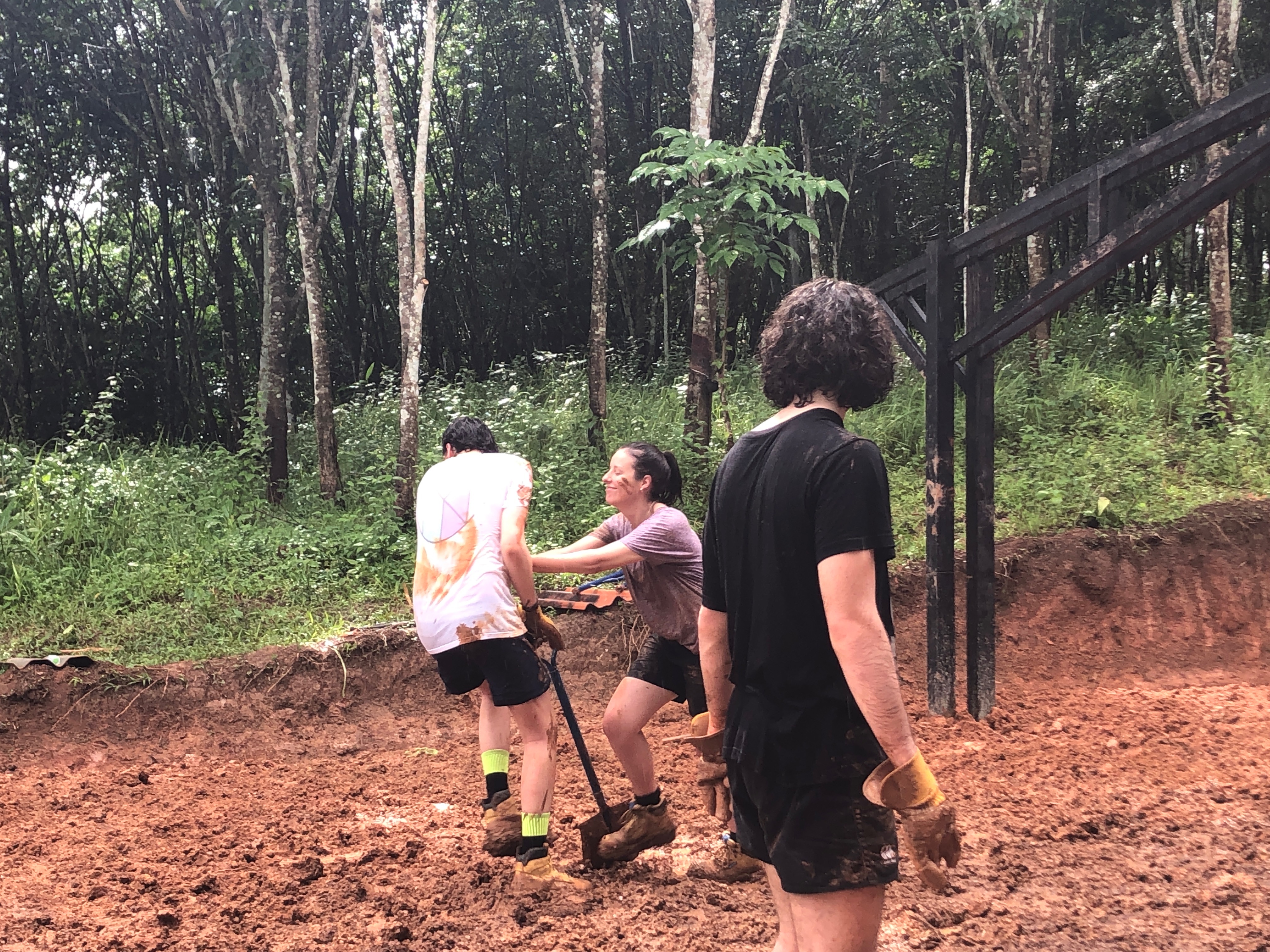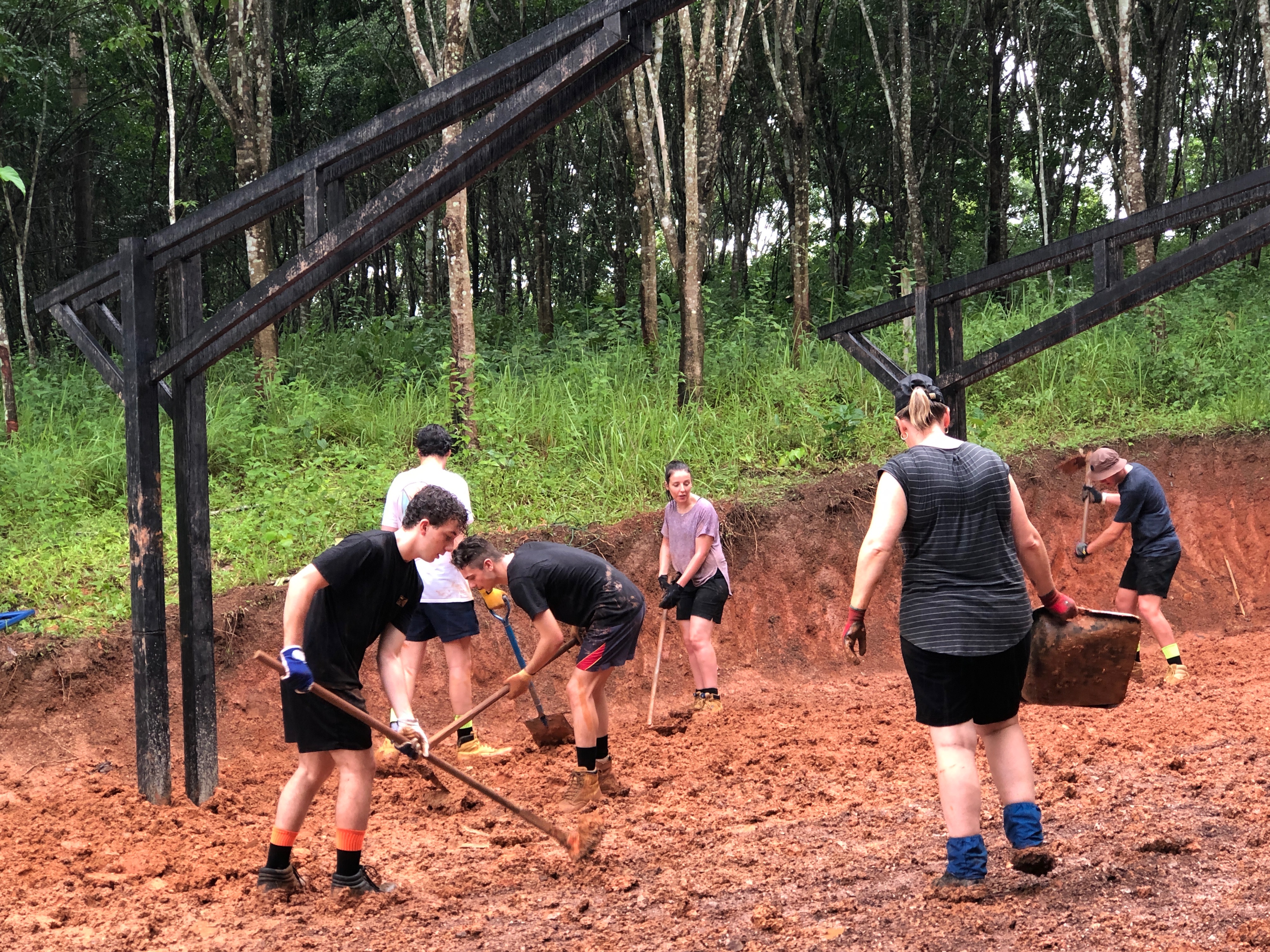 After breakfast, due to the overnight rain, we put a hold on the carpark work and instead began to form a “human centipede” as Billy’s analogy describes, as we transported two truck loads of gravel down a steep flight of stairs to a tiered surface that was prone to flooding. With Ethan and James, the captains for the day at the head of the centipede, and Billy claiming the glory at the tail-end, the “legs”, who worked away tirelessly all morning. Just as we thought we were getting close to finishing, another truck arrived and dumped another load at our displeasure.