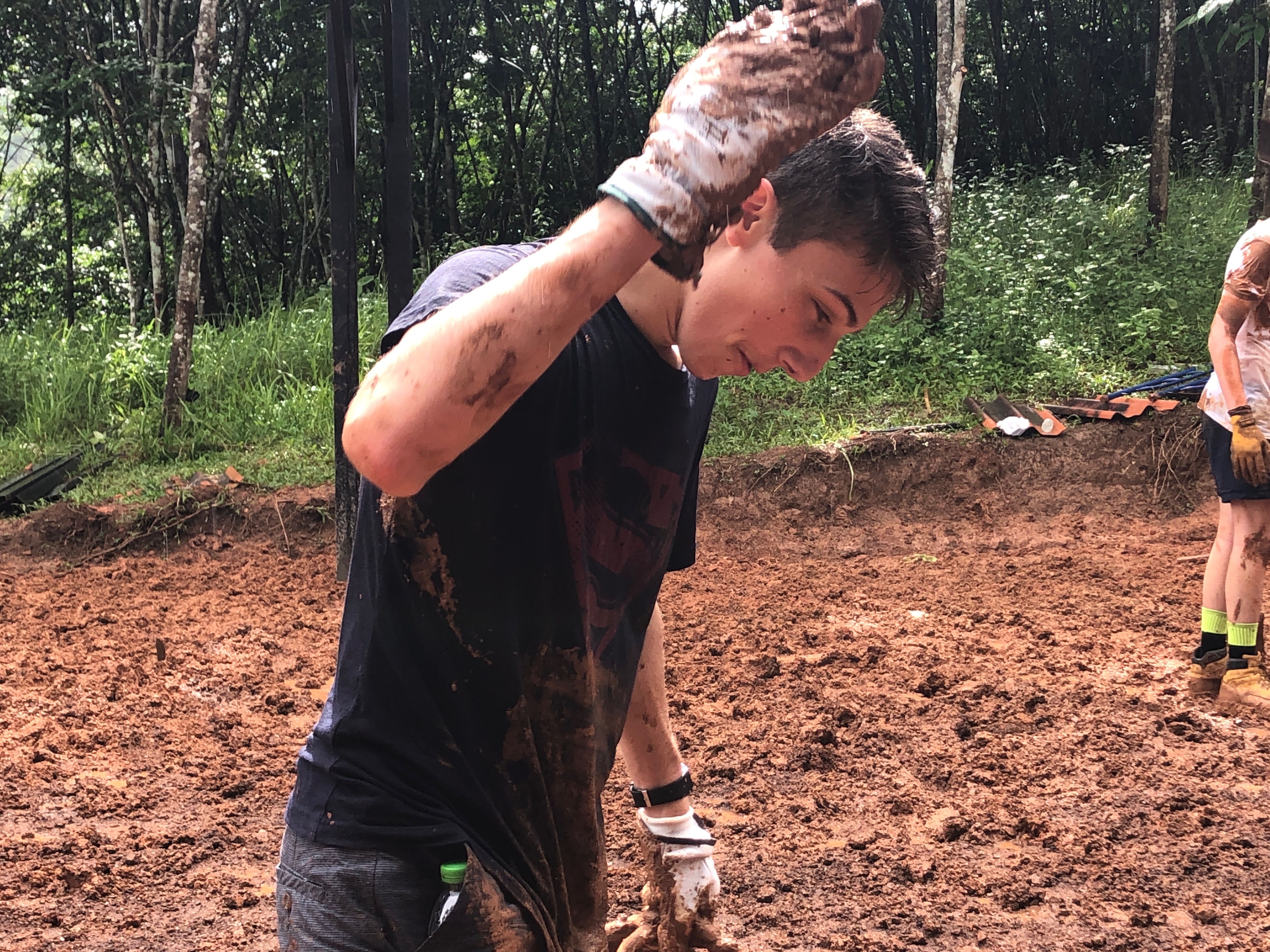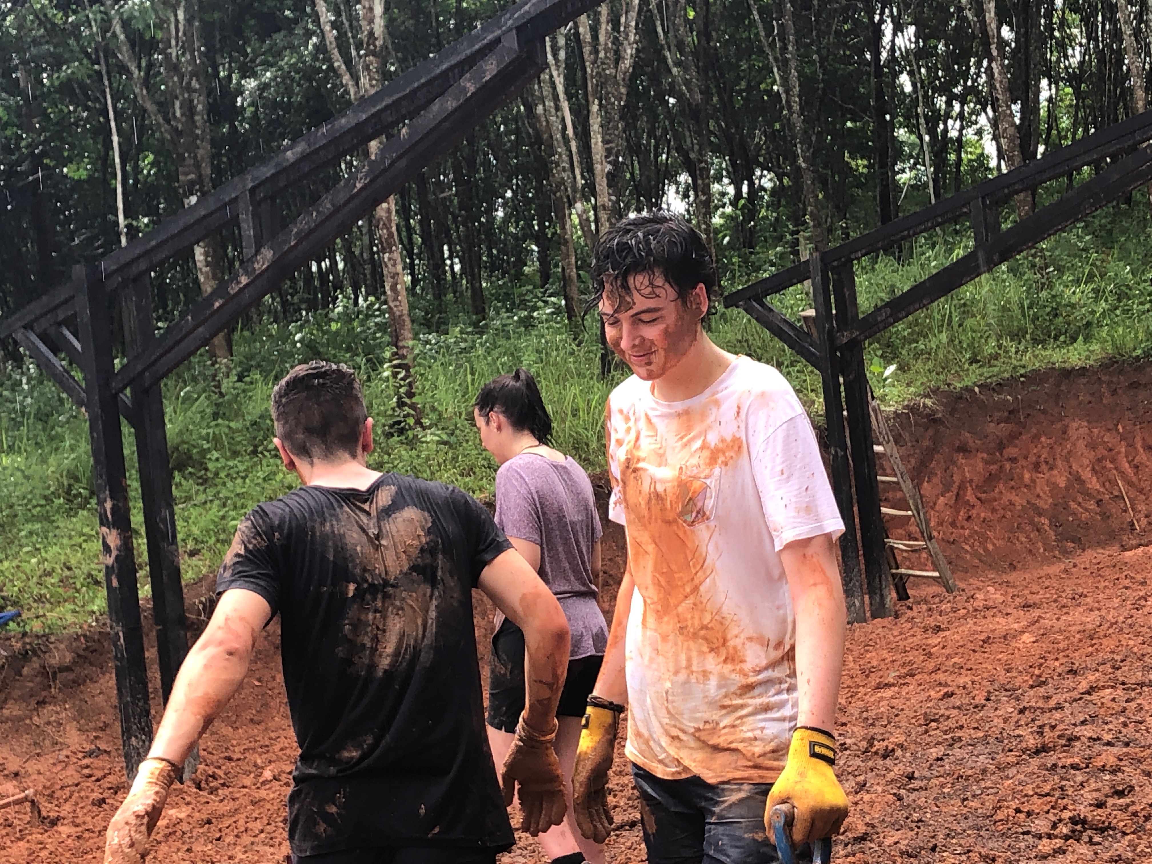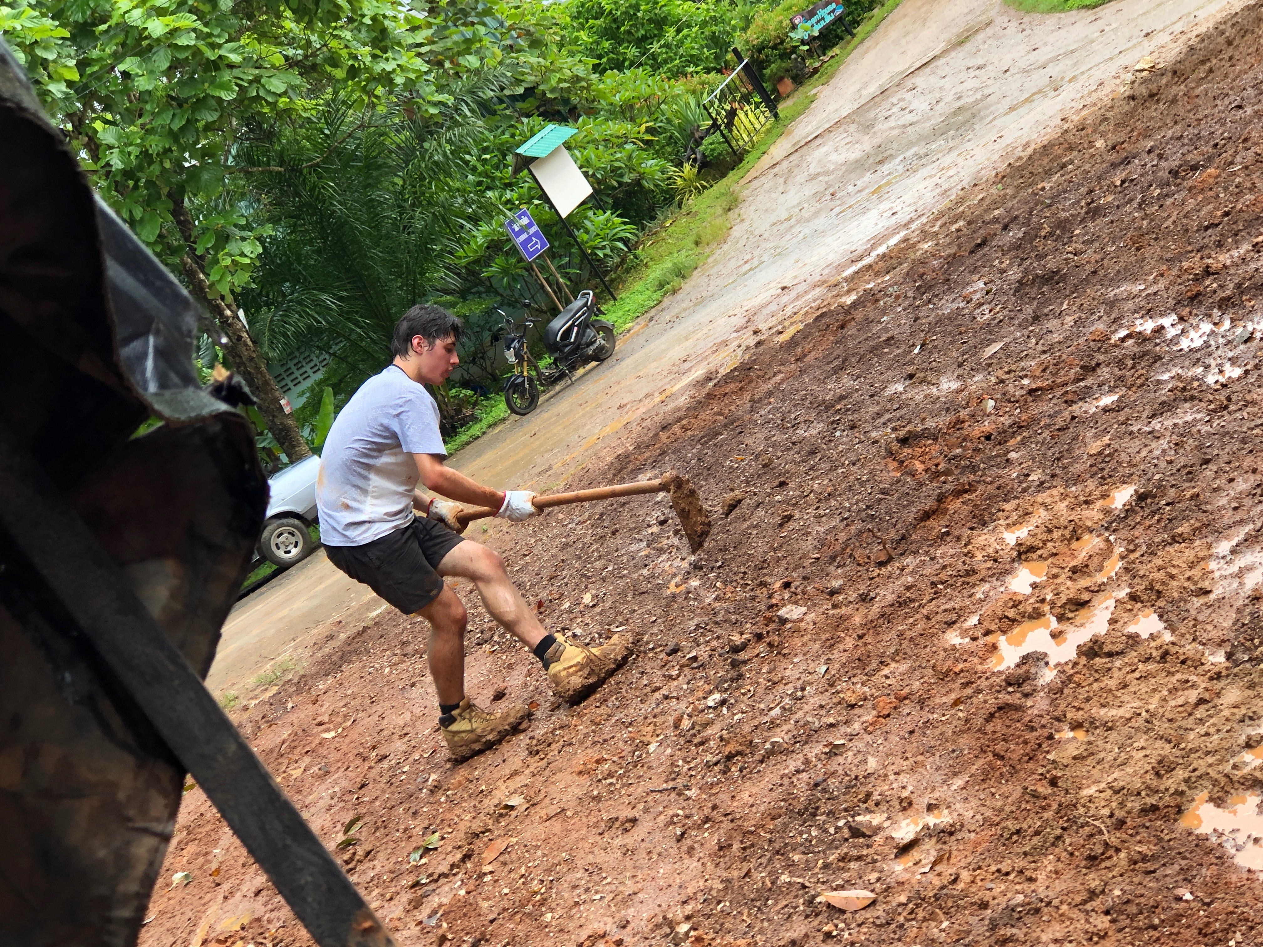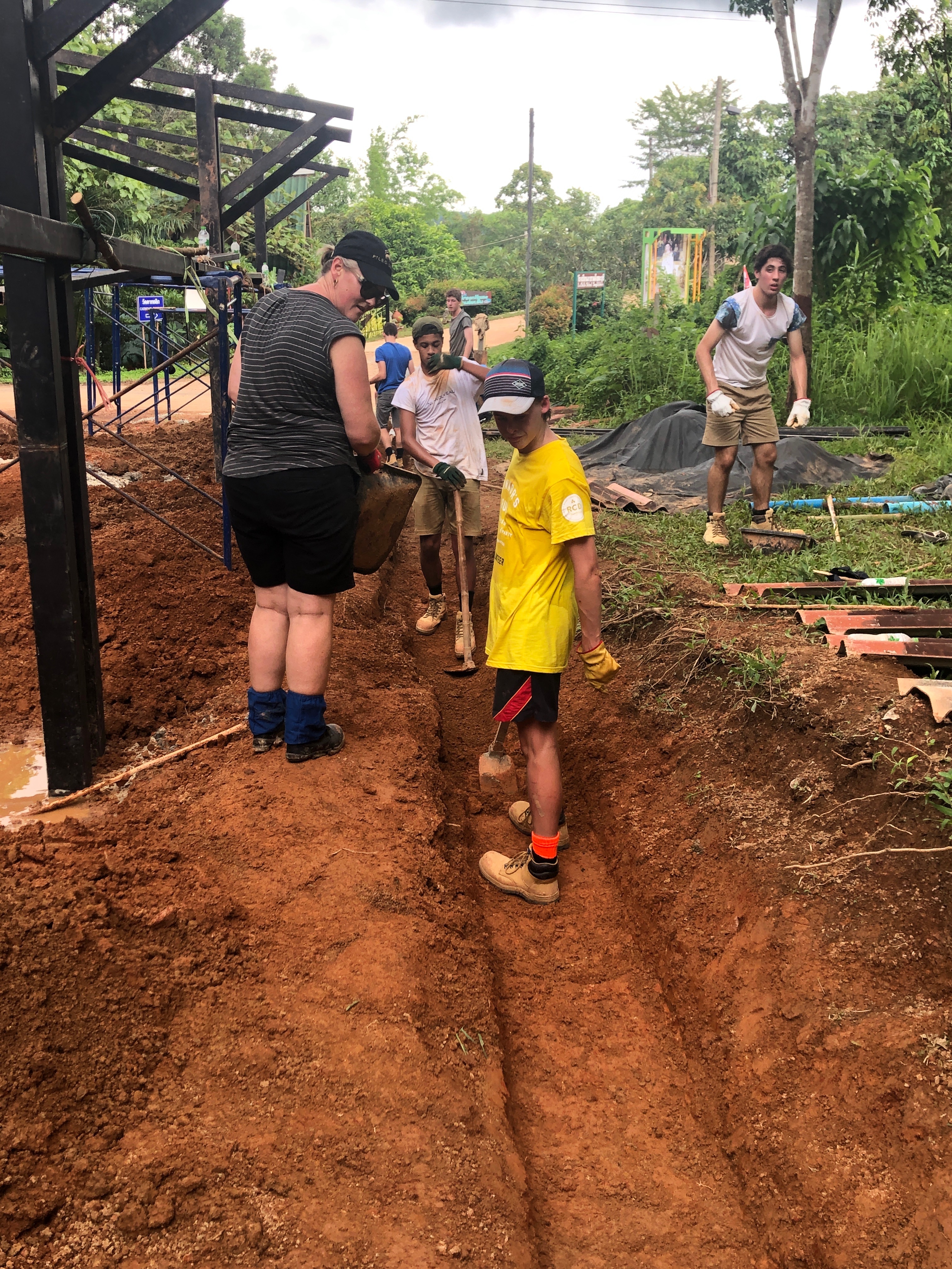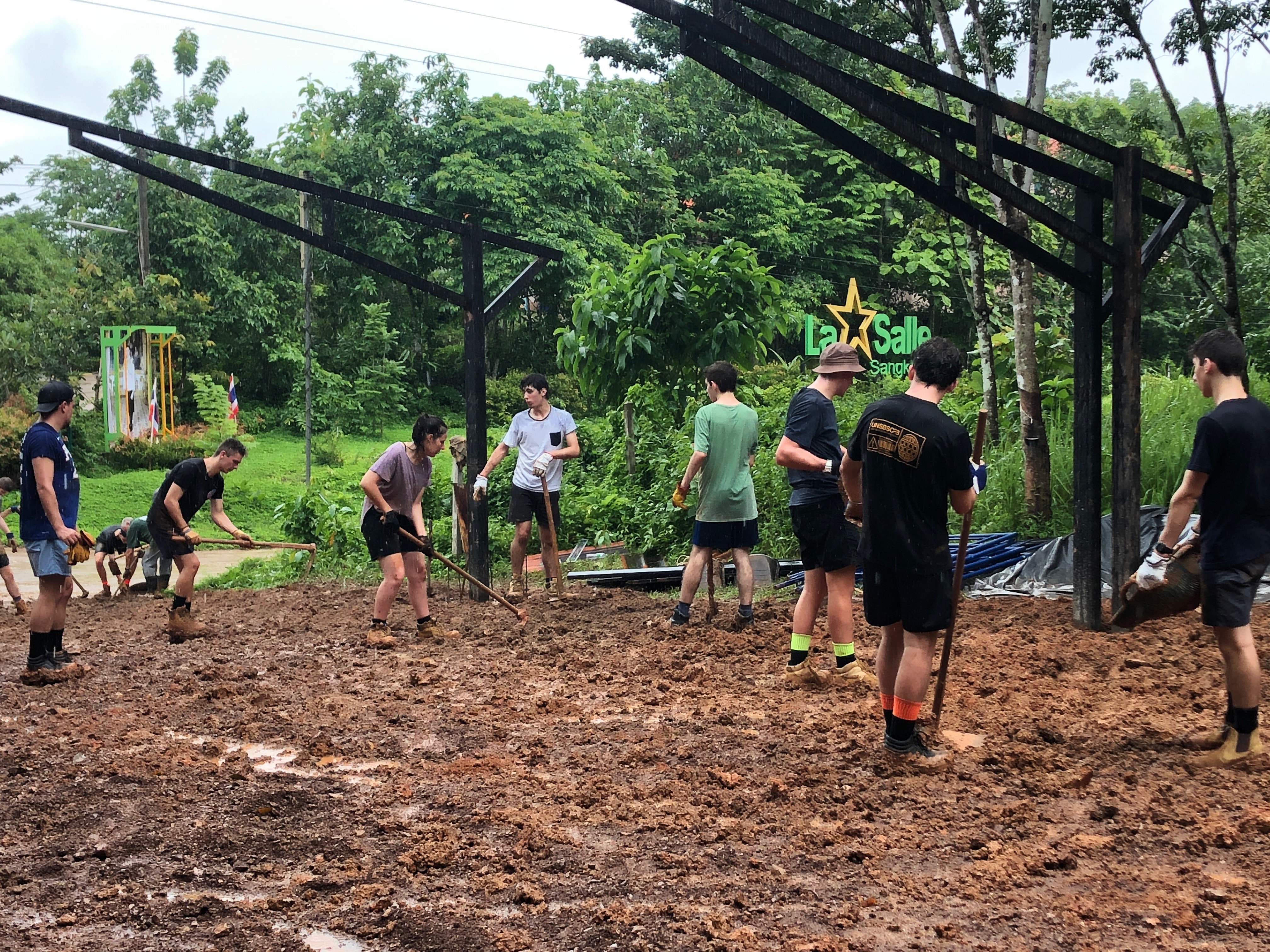 After breakfast, due to the overnight rain, we put a hold on the carpark work and instead began to form a “human centipede” as Billy’s analogy describes, as we transported two truck loads of gravel down a steep flight of stairs to a tiered surface that was prone to flooding. With Ethan and James, the captains for the day at the head of the centipede, and Billy claiming the glory at the tail-end, the “legs”, who worked away tirelessly all morning. Just as we thought we were getting close to finishing, another truck arrived and dumped another load at our displeasure.
