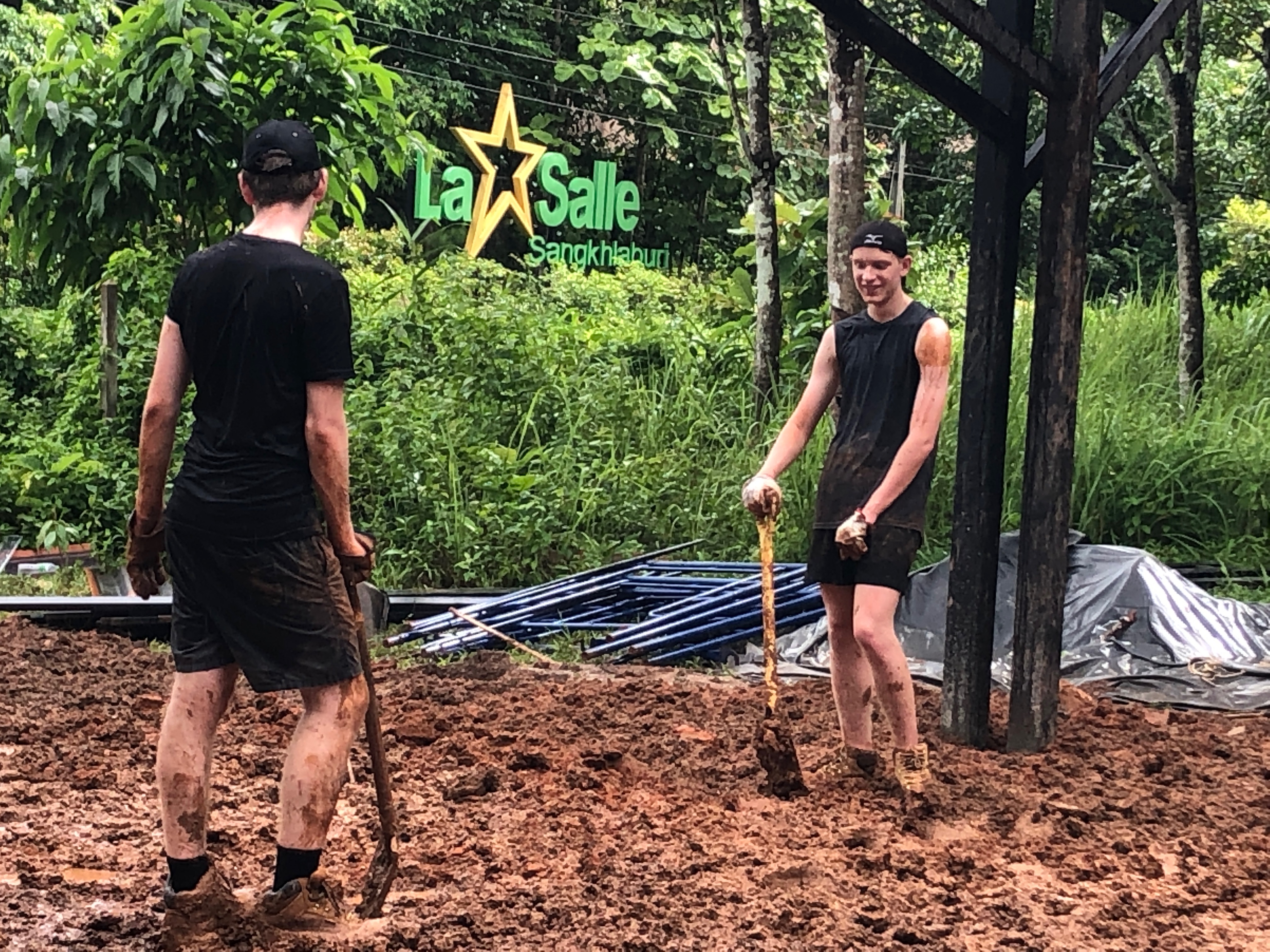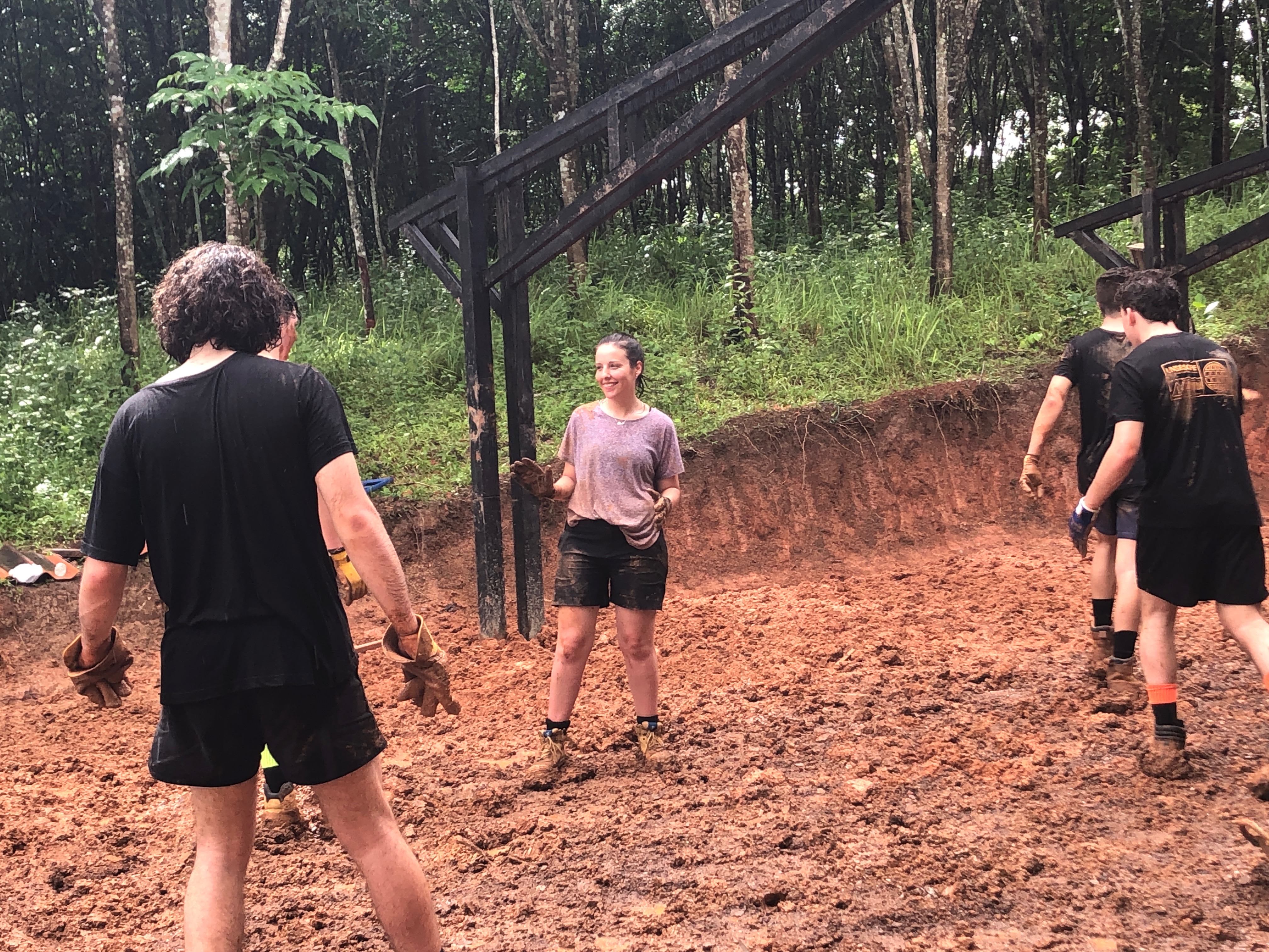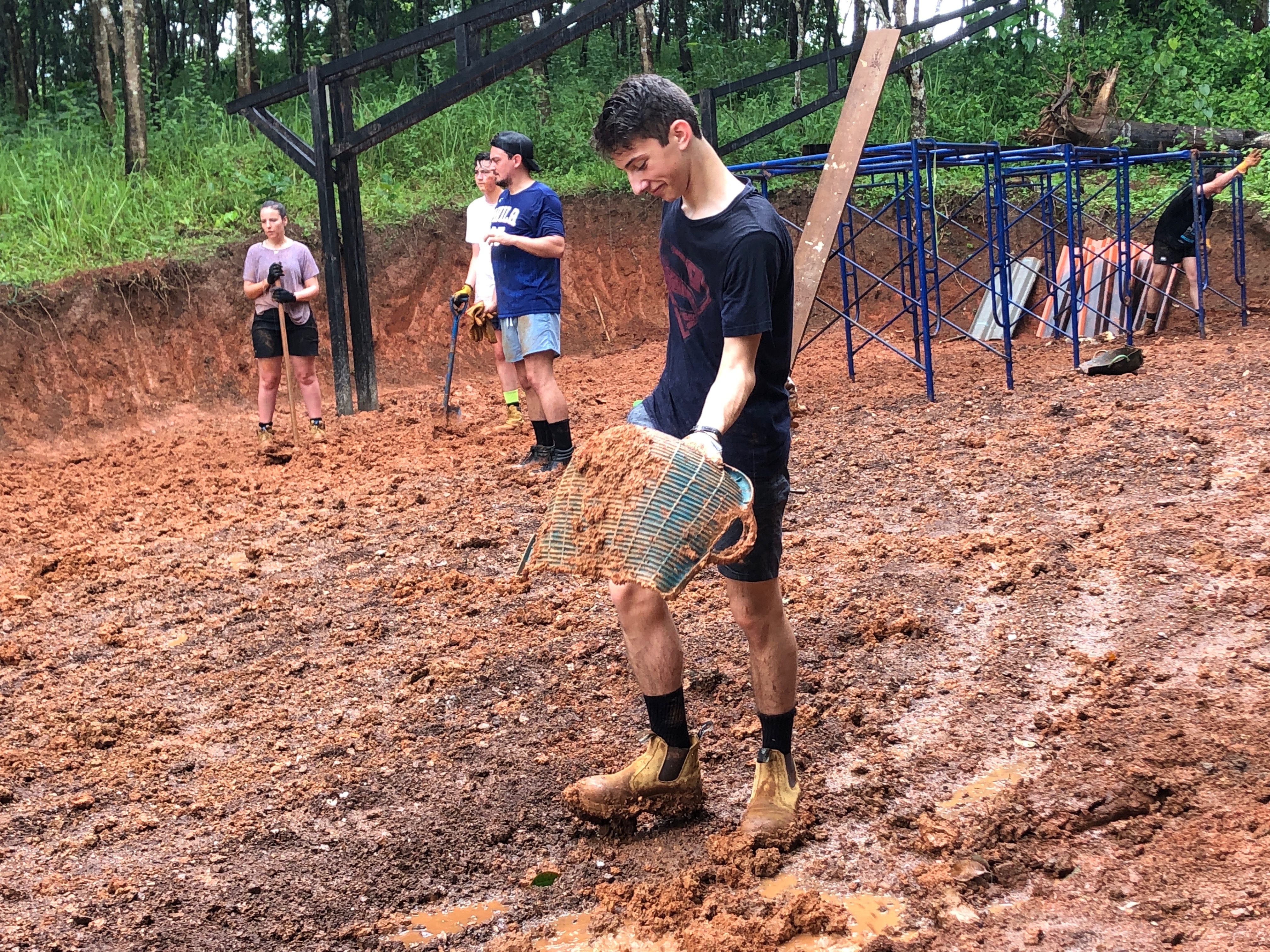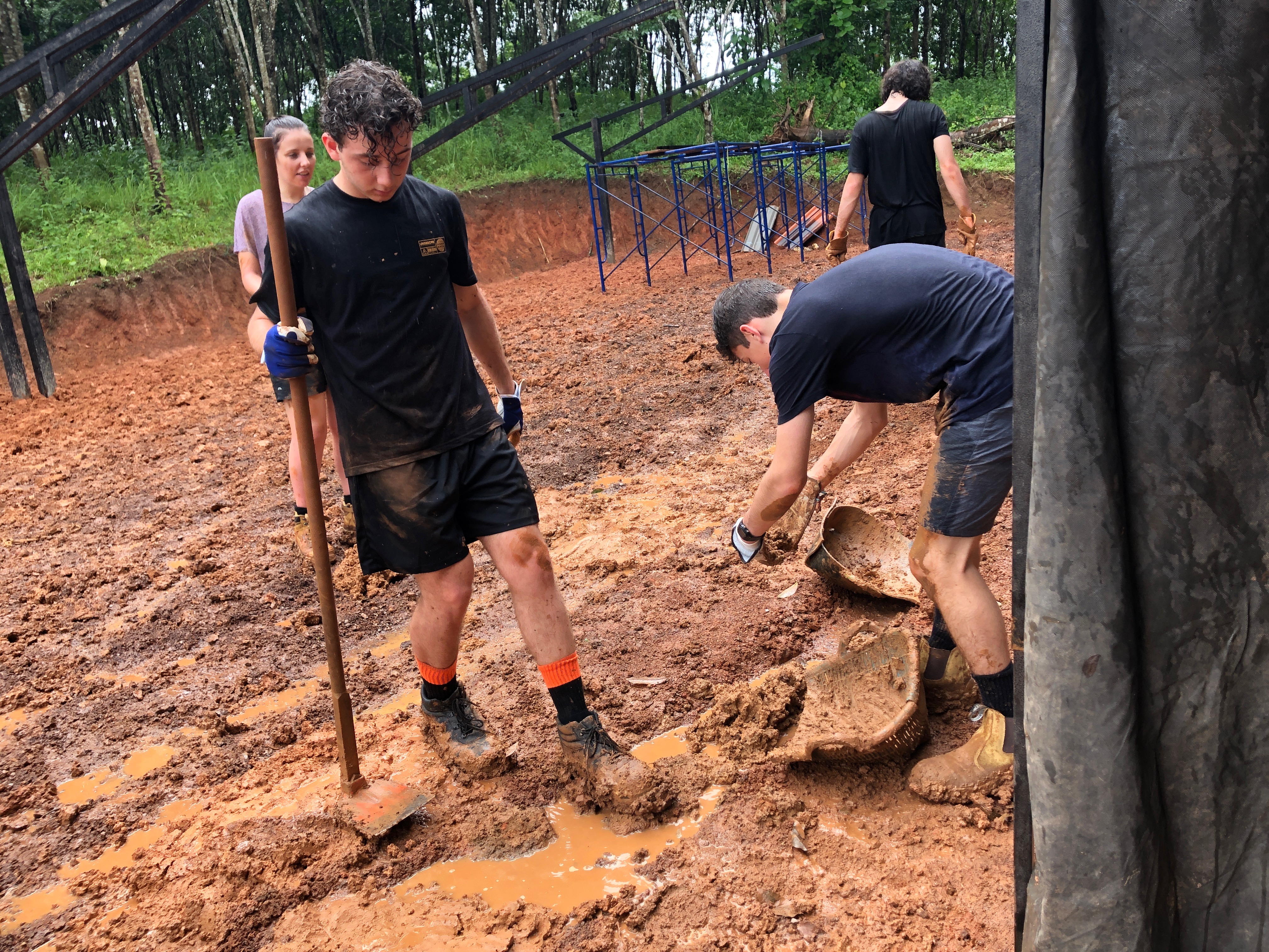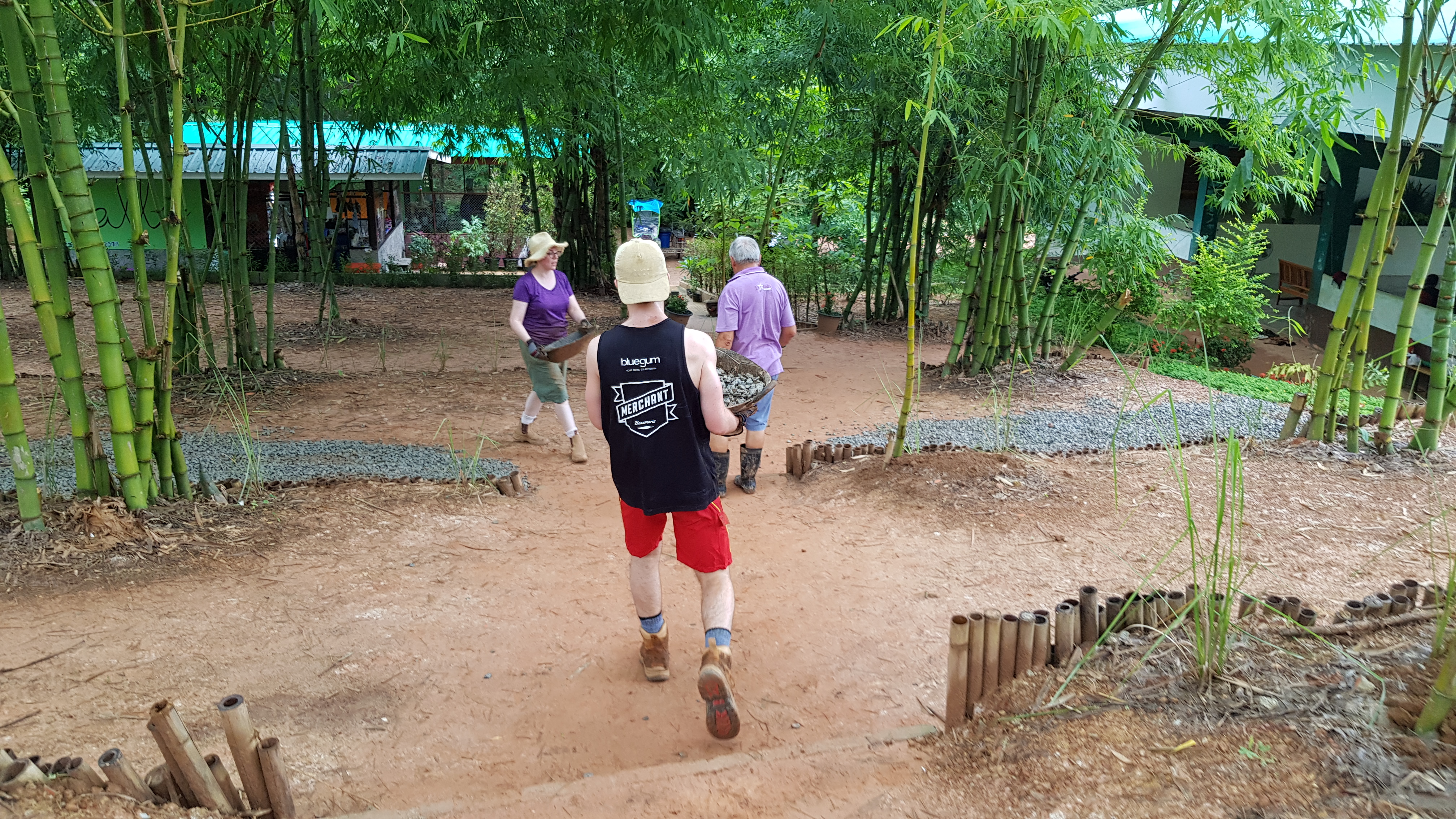 After breakfast, due to the overnight rain, we put a hold on the carpark work and instead began to form a “human centipede” as Billy’s analogy describes, as we transported two truck loads of gravel down a steep flight of stairs to a tiered surface that was prone to flooding. With Ethan and James, the captains for the day at the head of the centipede, and Billy claiming the glory at the tail-end, the “legs”, who worked away tirelessly all morning. Just as we thought we were getting close to finishing, another truck arrived and dumped another load at our displeasure.