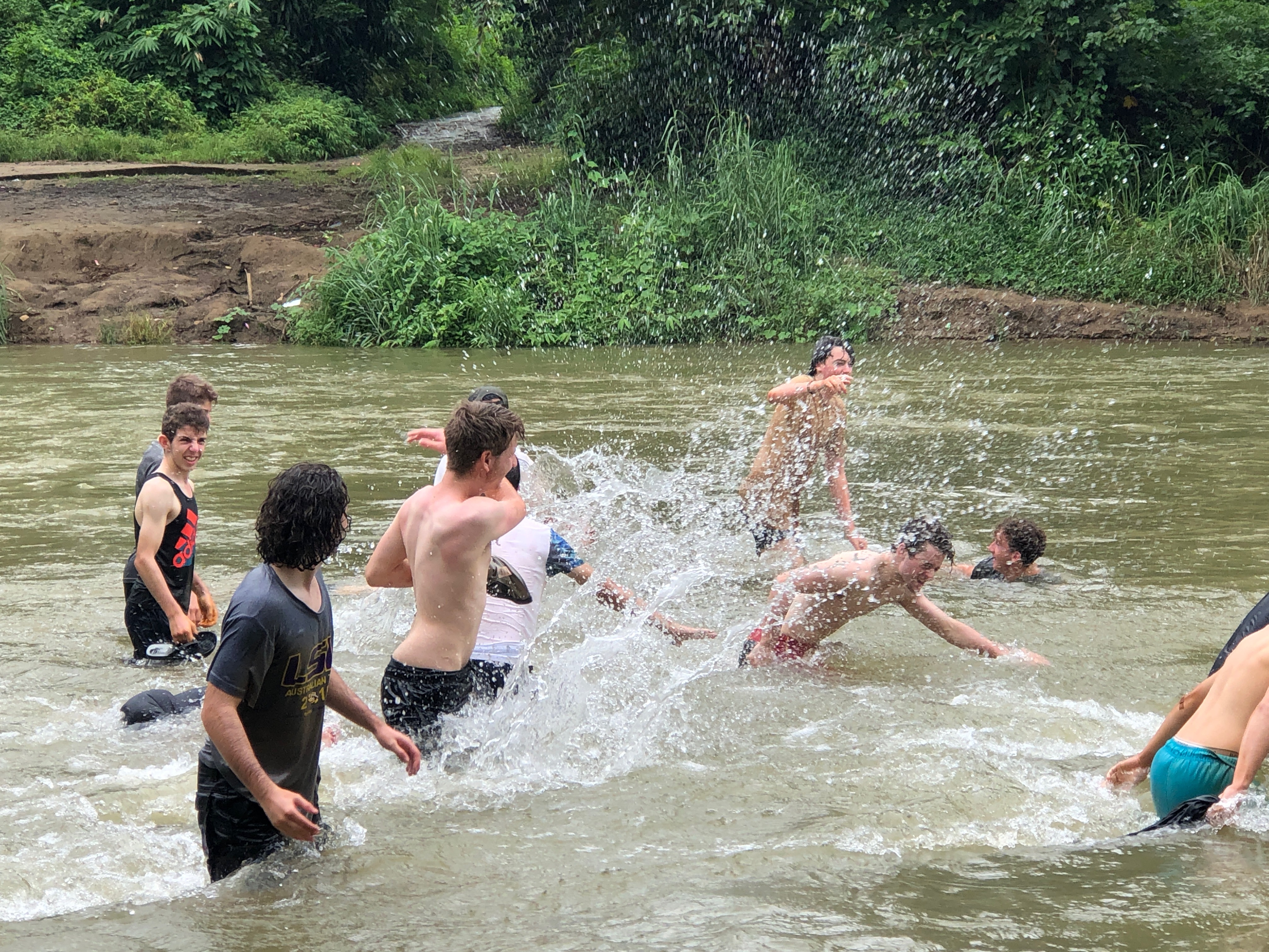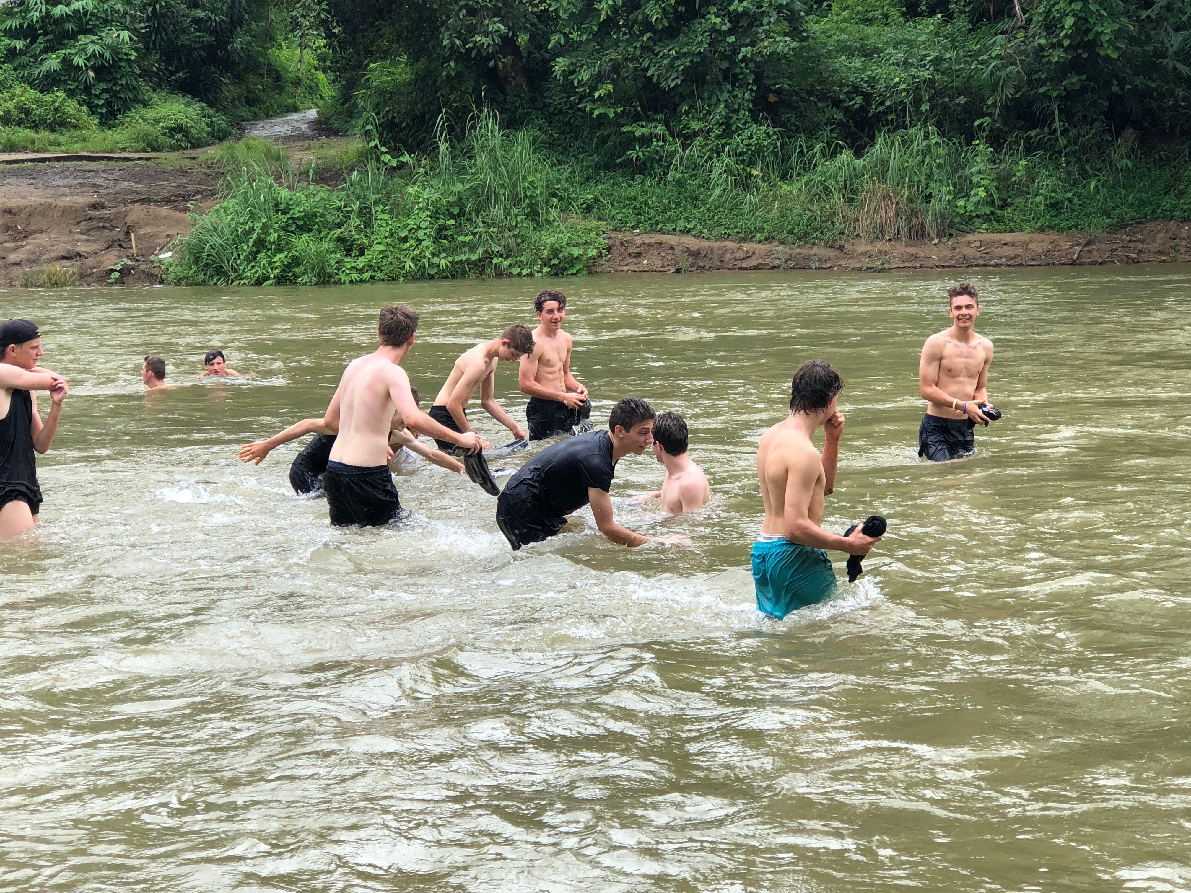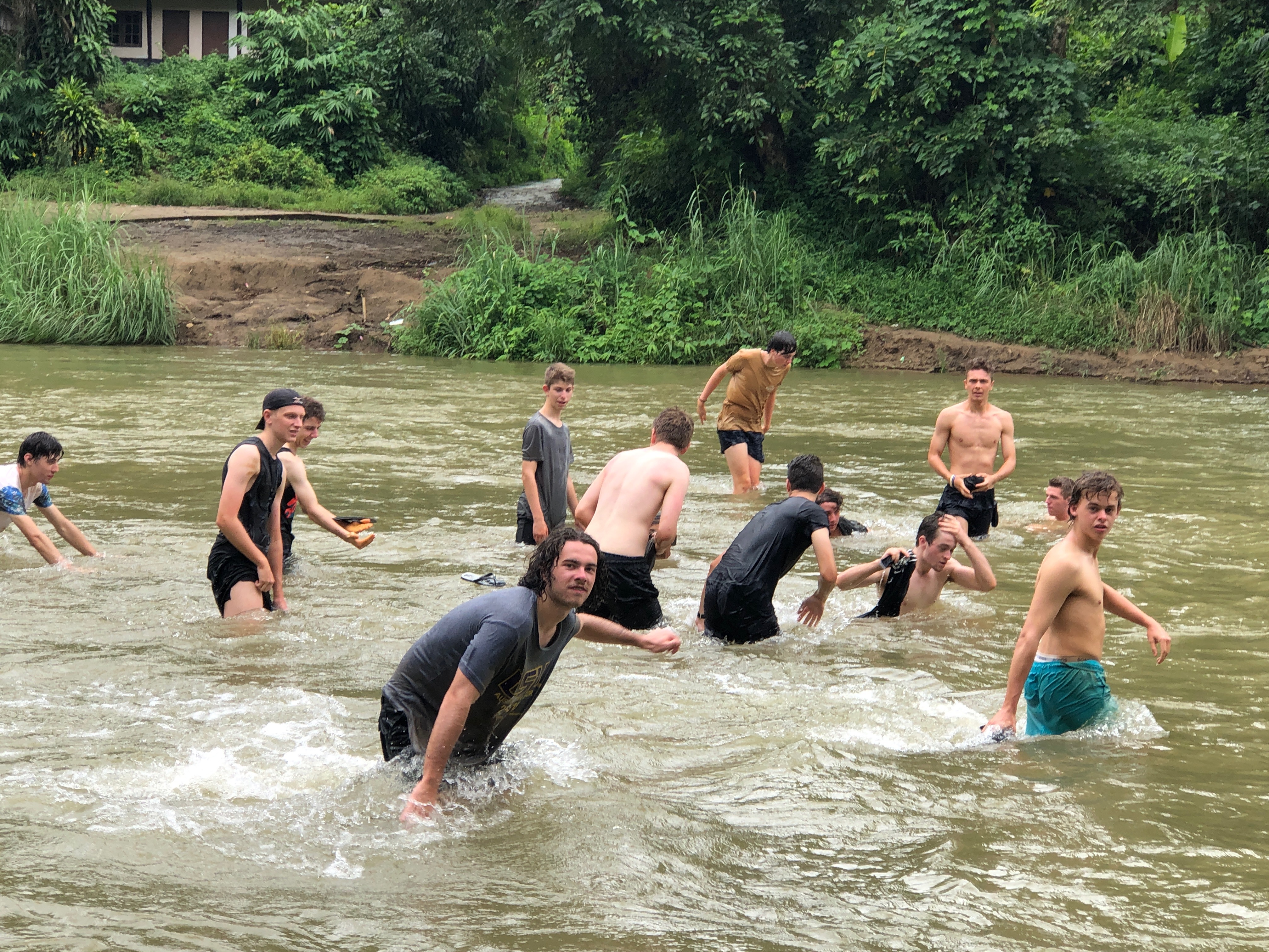 After lunch, we recommenced work to see Br. Mario (Maz) hacking away at the pile of gravel, preparing it for our return. As the human centipede regrouped we seemed to be missing a pair of legs in Bubba Winberg, who so happened to return just as the last bucket load was passed down the line. The stand out performer of the day was surprisingly Billy Bunn himself, as his landscaping skills were put on show. As the work concluded, we all jumped straight into the back of the ute (100% with all the required safety measures in seats, seatbelts and safety bars 😉) and headed down to the river to wash off all the mud, sweat and tears. The likes of Jonathan and Rohan were almost swept away by the fast flowing water, but luckily or unluckily we were in the presence of Liam, the lifesaver, who was more focused on the fish nibbling at his feet than the boys being washed away.