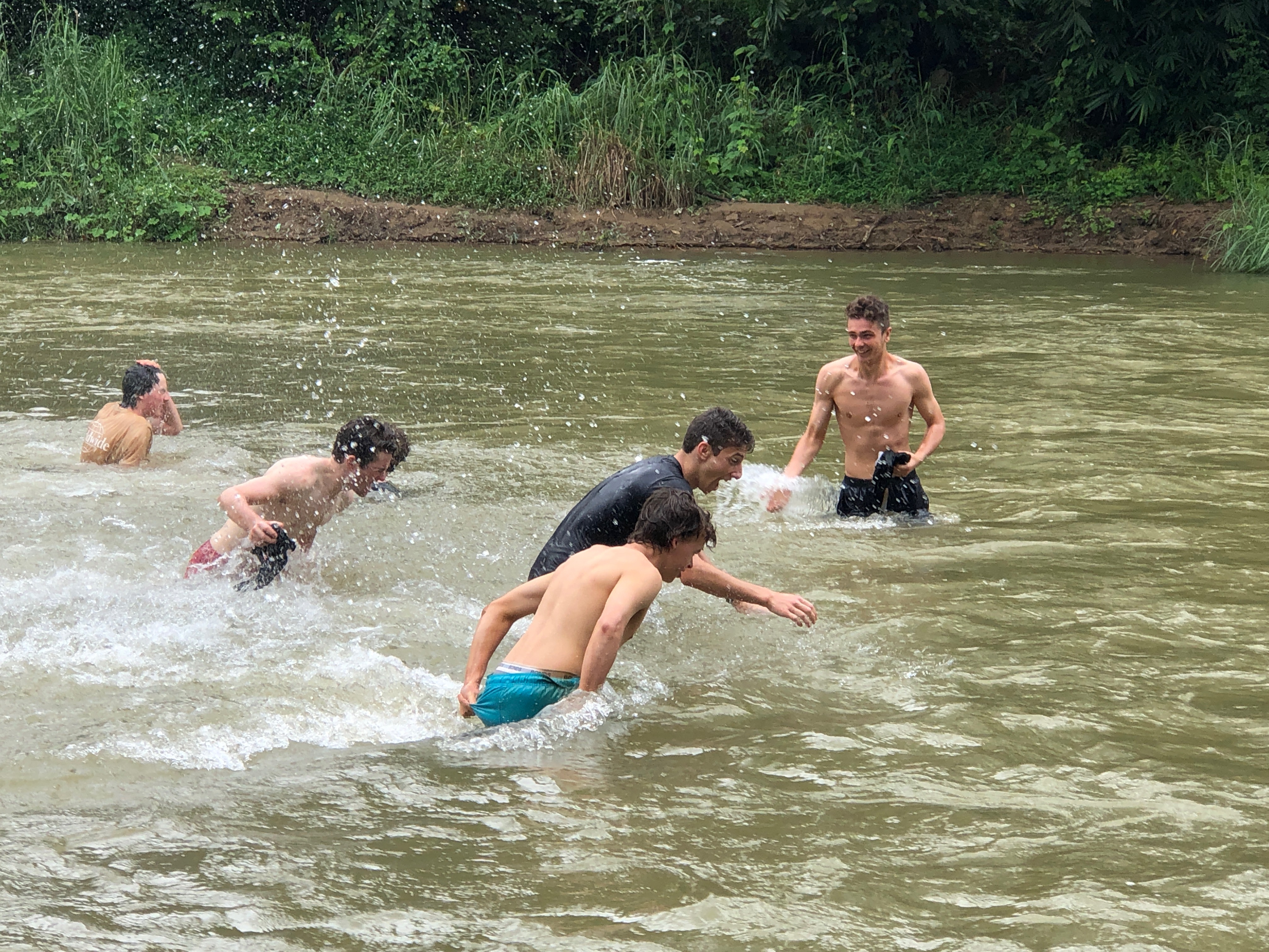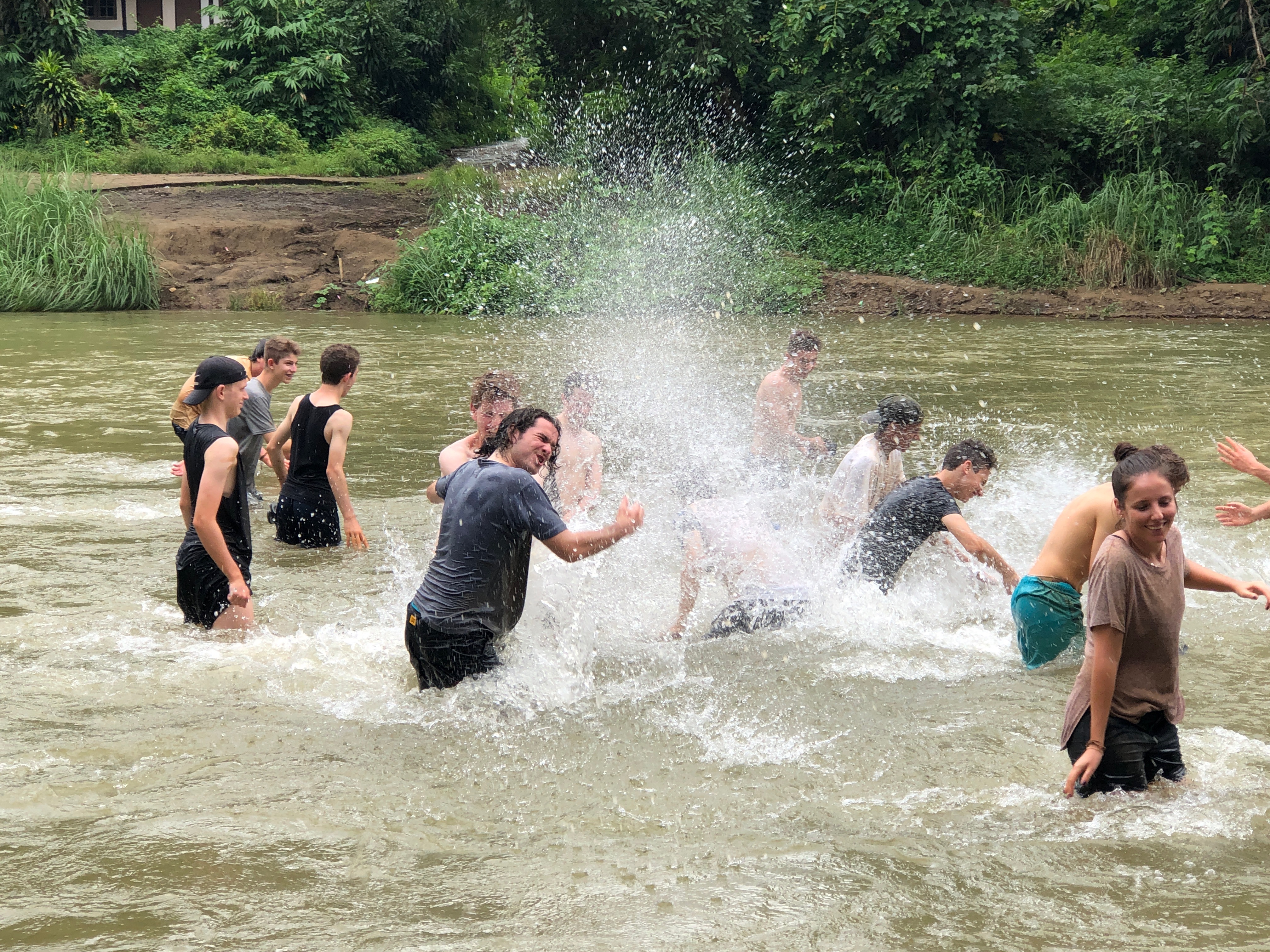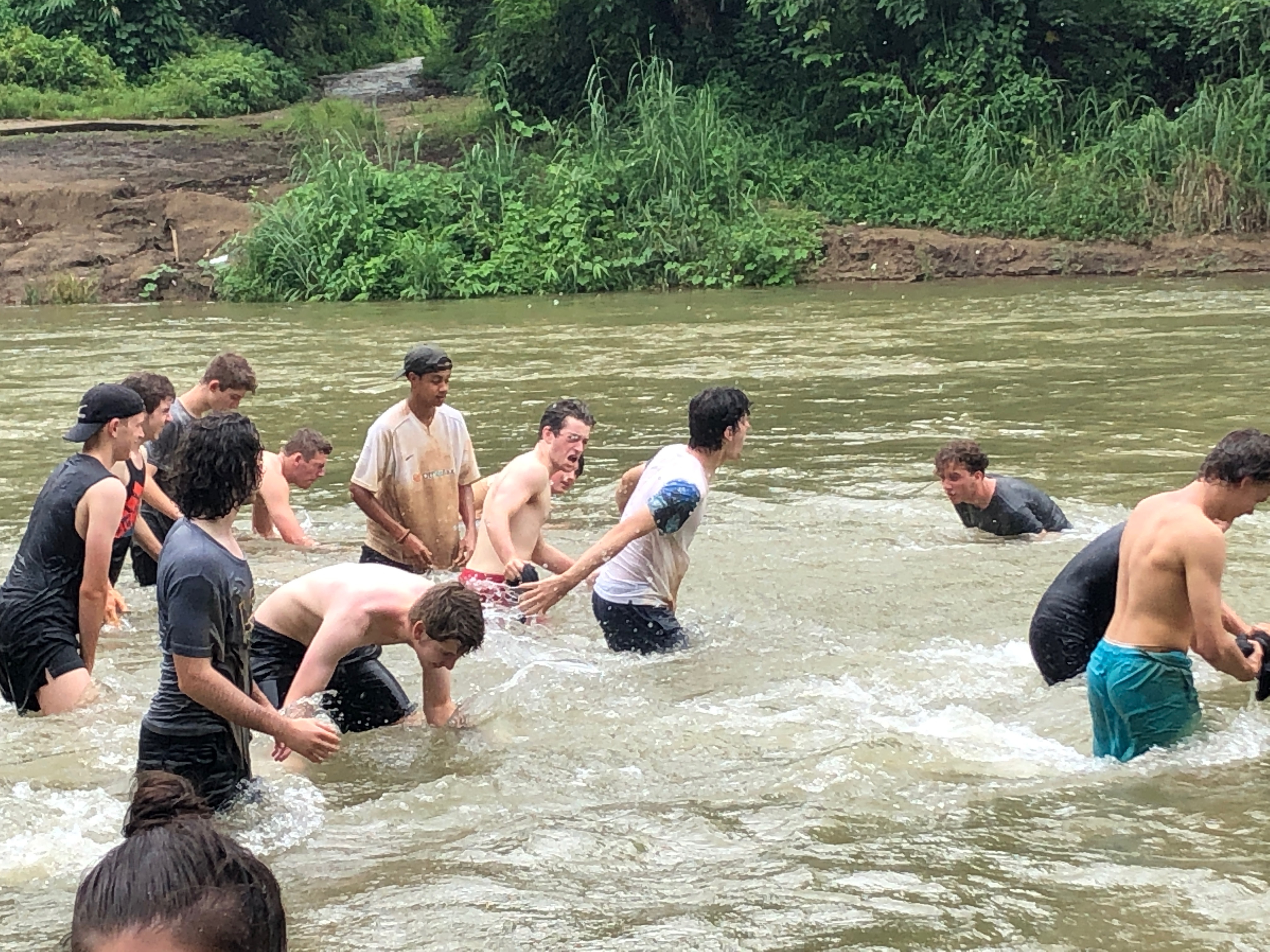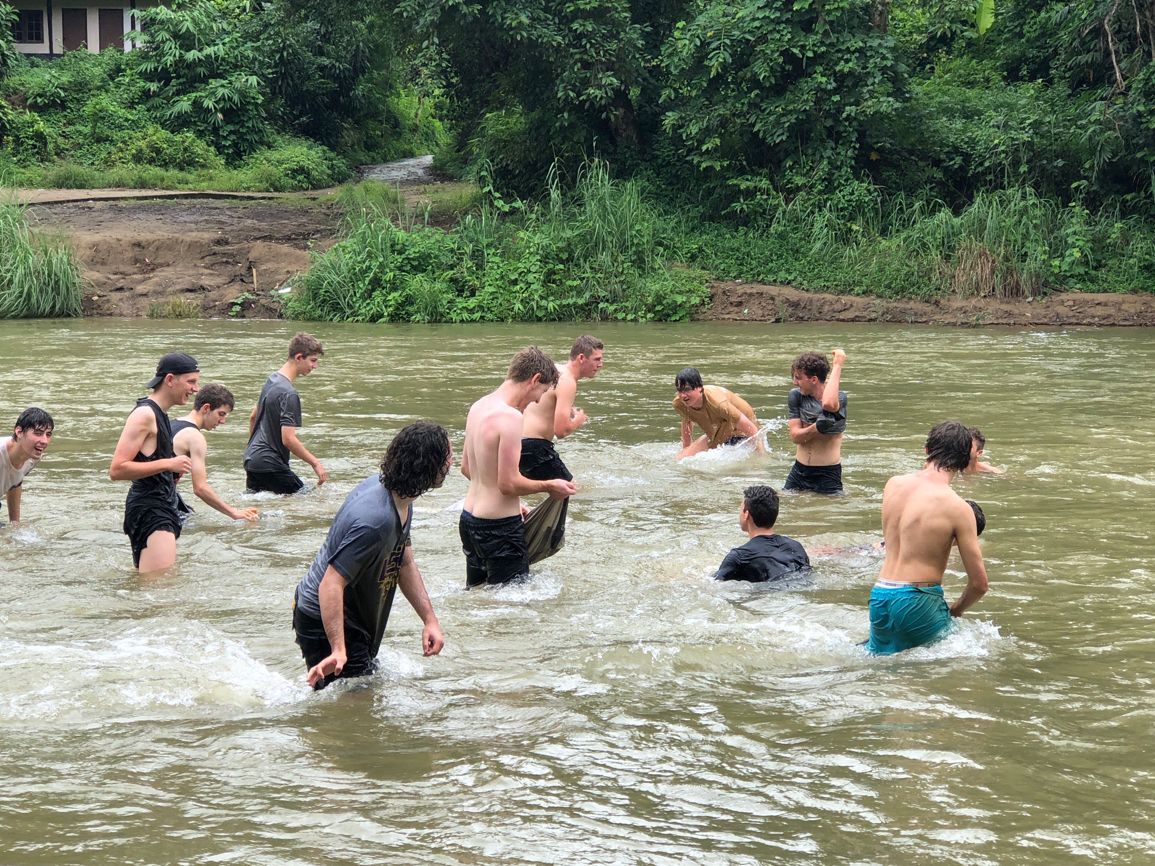 After lunch, we recommenced work to see Br. Mario (Maz) hacking away at the pile of gravel, preparing it for our return. As the human centipede regrouped we seemed to be missing a pair of legs in Bubba Winberg, who so happened to return just as the last bucket load was passed down the line. The stand out performer of the day was surprisingly Billy Bunn himself, as his landscaping skills were put on show. As the work concluded, we all jumped straight into the back of the ute (100% with all the required safety measures in seats, seatbelts and safety bars 😉) and headed down to the river to wash off all the mud, sweat and tears. The likes of Jonathan and Rohan were almost swept away by the fast flowing water, but luckily or unluckily we were in the presence of Liam, the lifesaver, who was more focused on the fish nibbling at his feet than the boys being washed away.